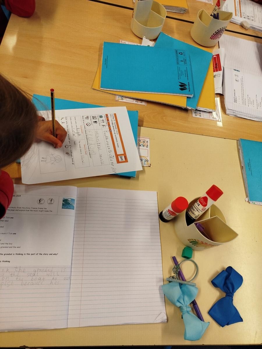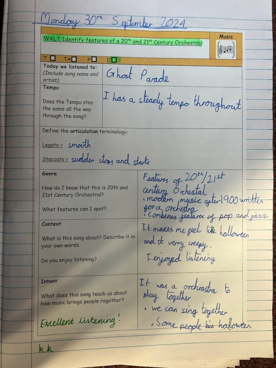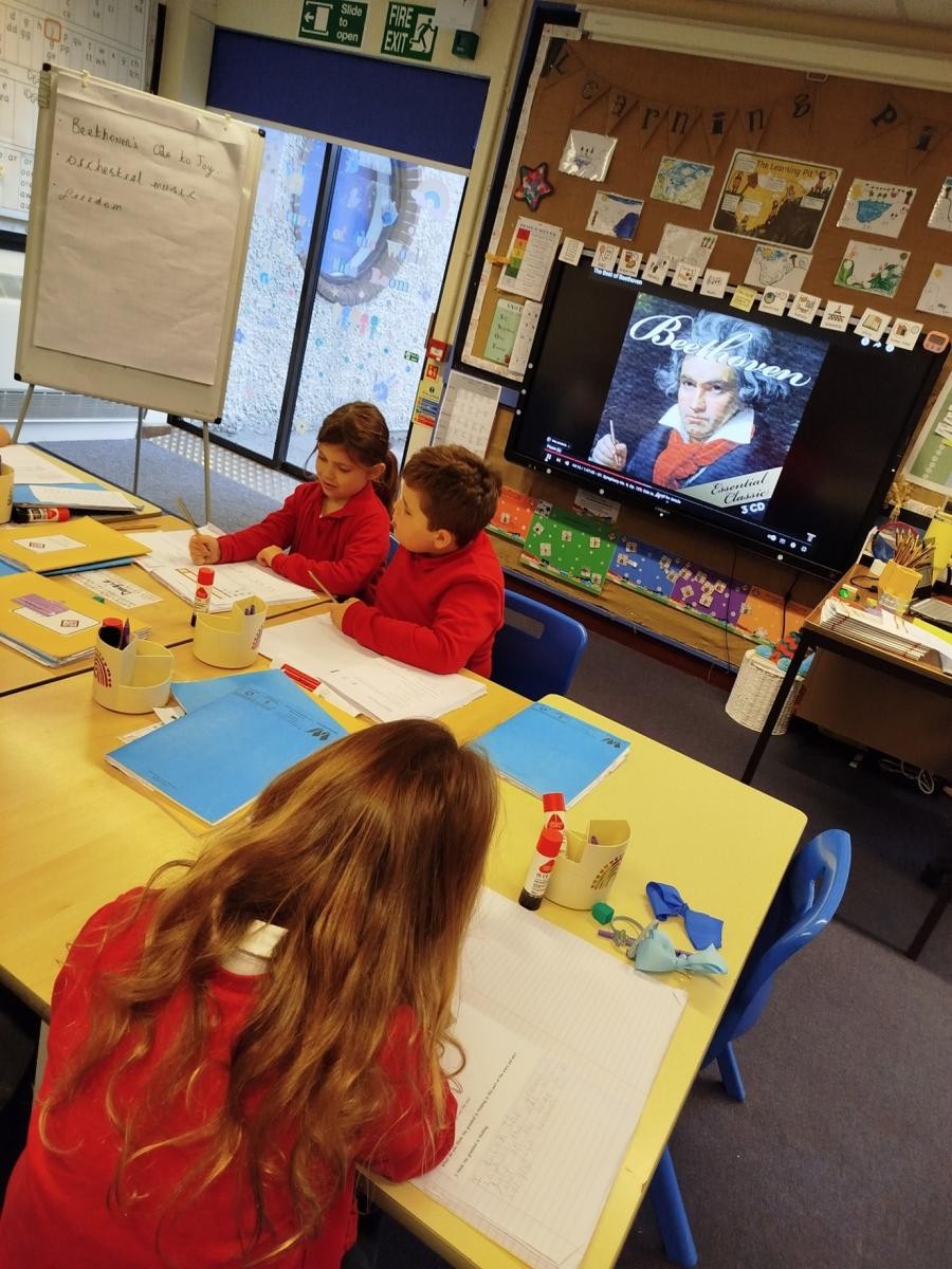 Modules of music teaching, taken from the Model Music Curriculum on Charanga are used to support and enrich our existing topics. Children are involved in creating music through the composition features on Charanga, with children using headphones on Chromebooks to allow for the whole class to partake in the activity. Children also learn how to describe the different purposes of music through different styles of composition.