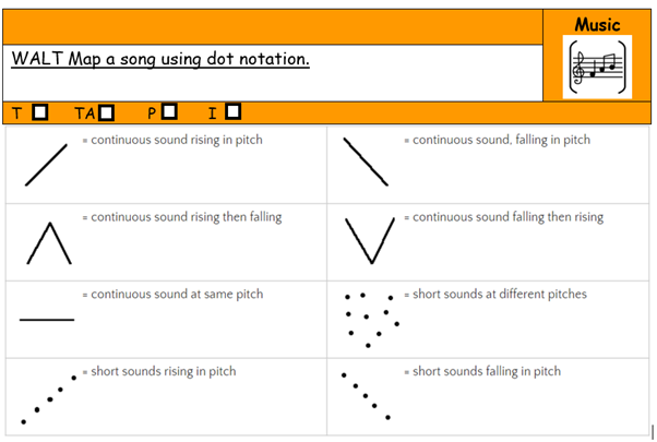 In year 2, tuned instruments are introduced, and children begin to experiment with composition and creating a Graphic Score. Within this, the children start understand how to use symbols to represent sounds as well as making connections between notation and musical sounds. In their singing, the children continue building upon their previous learning beginning to deepen their knowledge of how to sing and follow a melody.