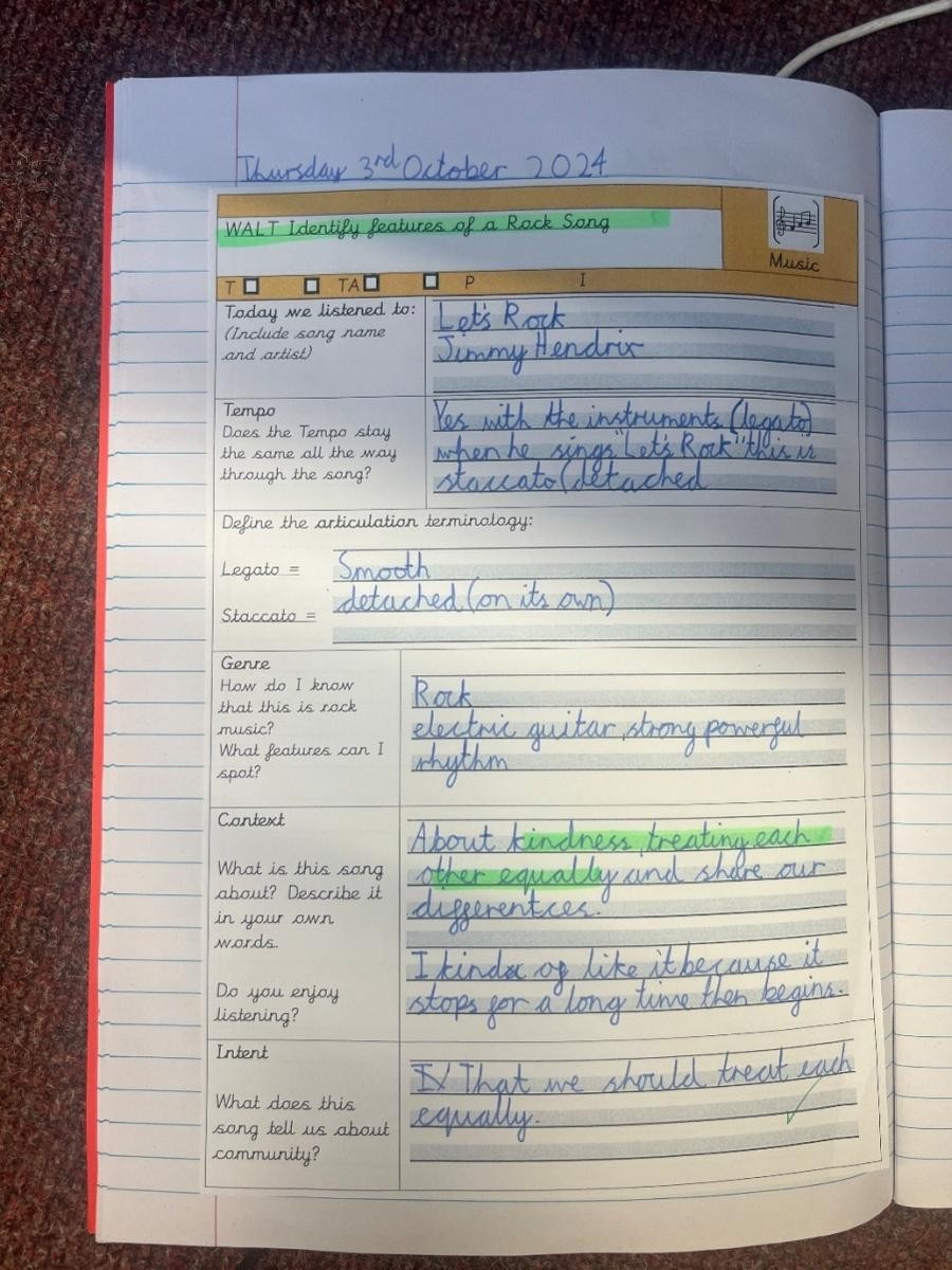 As a school we ‘block’ topic learning, and music is also taught in this way. We are informed by the model music curriculum (March 2021), which is non-statutory guidance for teaching music from Key Stages 1 to 3 or any other published curriculum guidance.