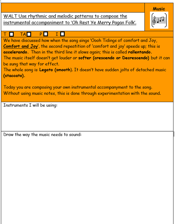 - develop musical skills and concepts through listening & appraising, singing & playing, composing and performing.